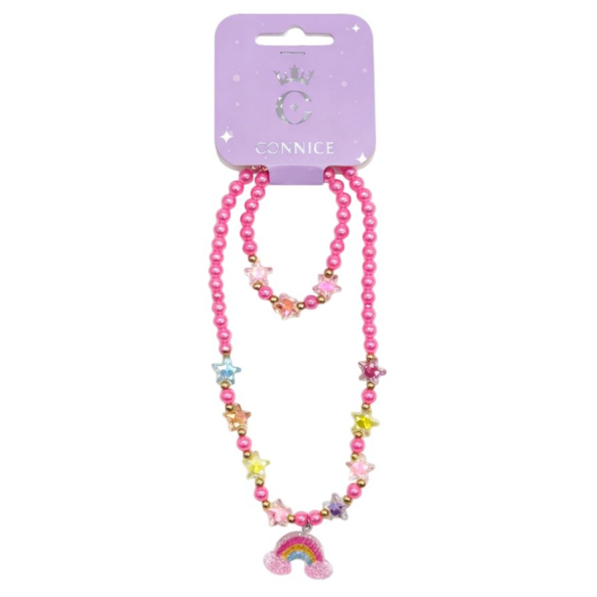 Kids Necklace & Bracelet Set Hot Pink Beads With Star & Rainbow Charm