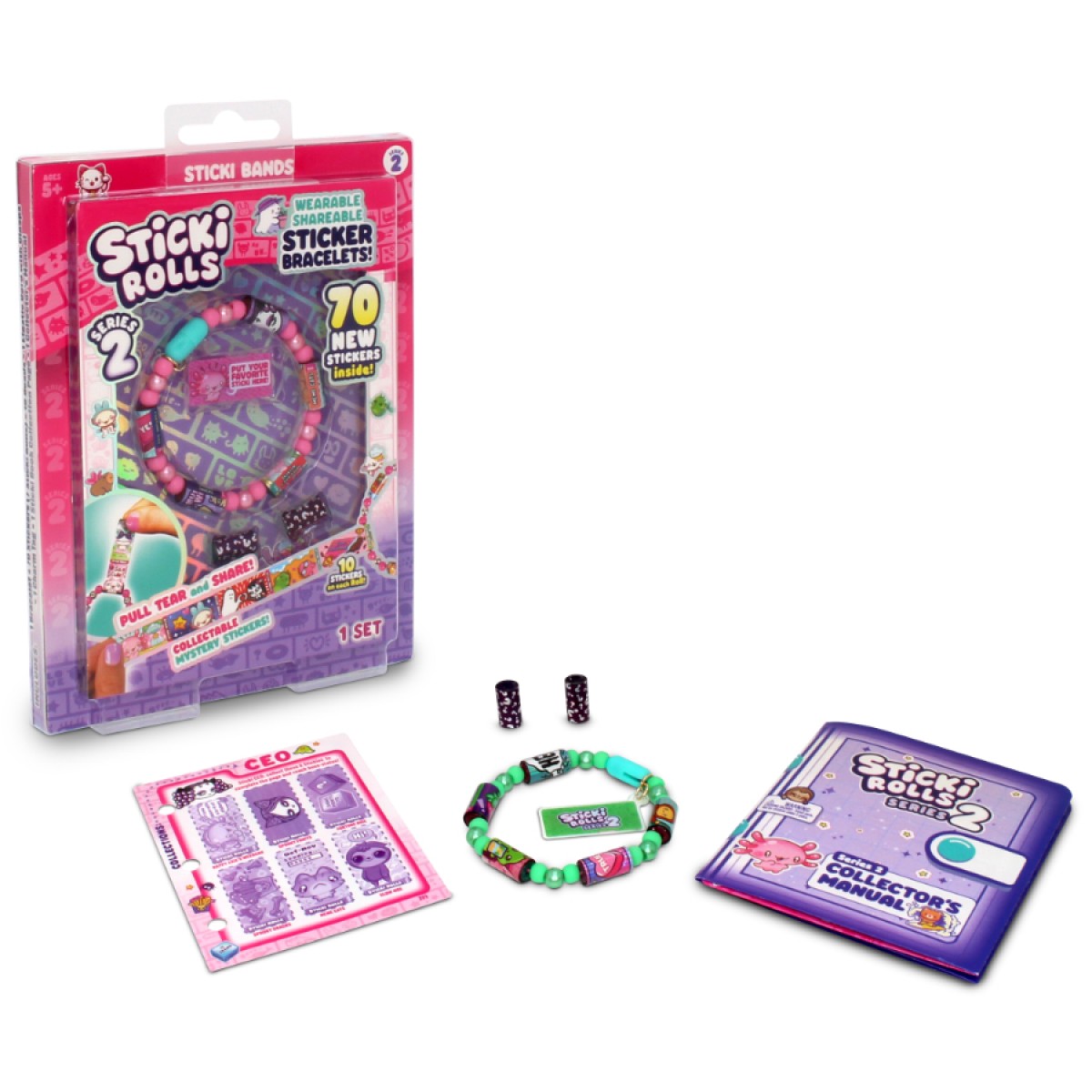Introducing Sticki Rolls Sticki Bands, the first-ever wearable, shareable sticker bracelets! Each bracelet holds 5 sticker rolls, with 10 holographic mini stickers per roll. Pull, tear, and share your kawaii-themed stickers with friends at any time.