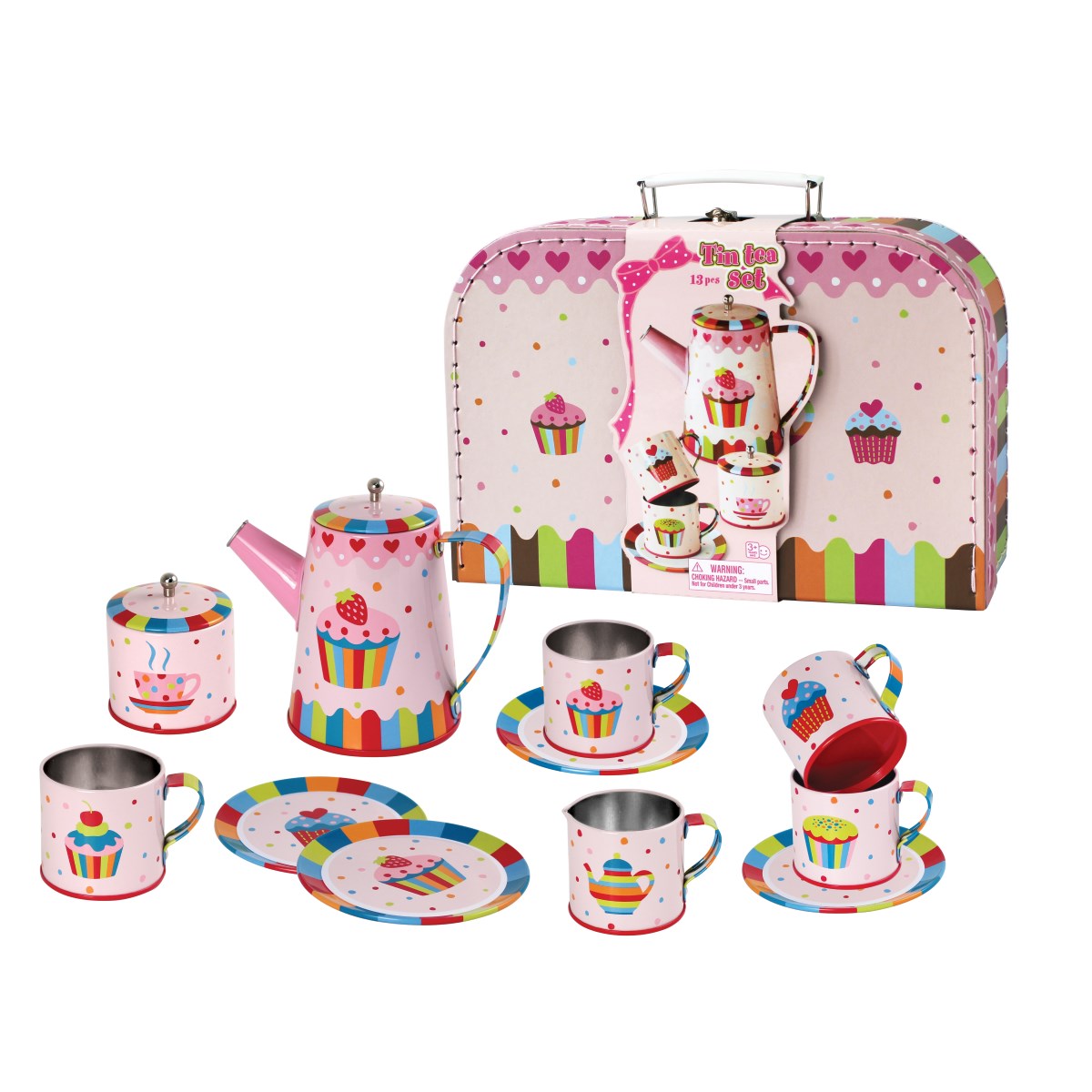 This is a traditional tea time playset whereby the tea set pieces are made of tin instead of plastic or other materials. This tin tea set is a classic "unplug" toy set that was popular when there were no video games or electronic gadgets. Young girls love to play-act with this tea set and host a tea party with friends or their stuffed toys or even their dolls and pretend play to be the host, just like when their moms entertain their guests. These tea set pieces are nice pink with a feminine touch and are decorated with multi-coloured dots at random and with the main cupcake decoration. This playset looks nice and delicious at the same time. Young children love pouring pretend cup of tea and pretend to feed their toys. This kind of pretend play activity helps young children to develop emotional, social and cognitive behaviour. Suitable for ages 3 and up.